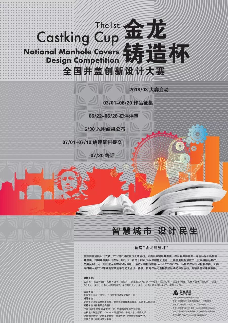 首届“金龙铸造杯”全国井盖创新设计大赛是在湖南省经信委等指导监督下,由湖南省工业设计协会和长沙金龙铸造实业有限公司联合主办,以城市井盖产品为对象的专项创意设计竞赛。本次大赛呼吁设计者一起关注城市建设,以井盖的创新设计为指引,弘扬全民创新精神,为民生服务而设计,为城市的公共生活而设计,将互联网+、绿色制造、文化艺术等与之结合,创造更为完美的井盖及相关配套产品。大赛同时纳入到2018年湖南省政府举办的工业设计赛事,优秀作品可直接参加后续的评优活动,奖项奖金可兼获兼得。